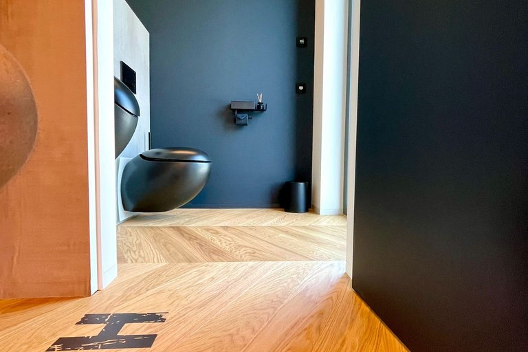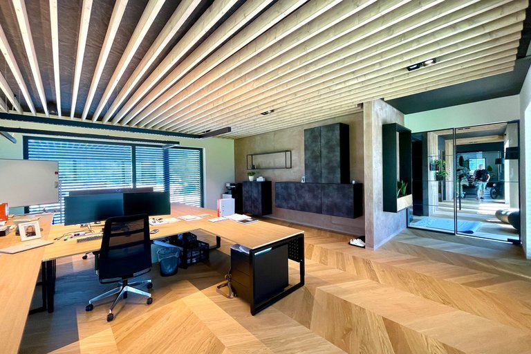 This company has taken all of this to heart in its recently constructed office building and shines with its absolutely modern and sustainable construction method in which a lot of wood was used. Our chevron flooring stands out in particular. The classically modern installation pattern, which was even produced in a special format at the customer's request, has personality and forms the absolute centerpiece of the interior design. It creates a sustainably stylish atmosphere and a healthy indoor climate.