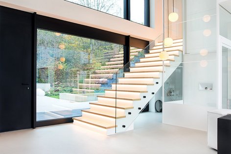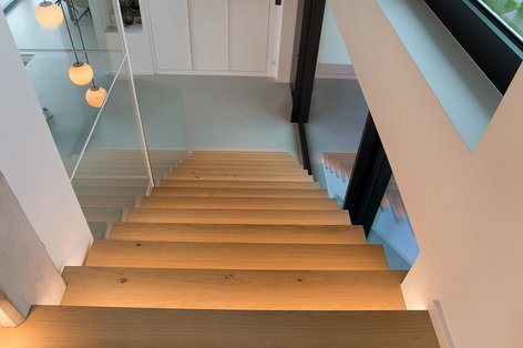 The light, warm texture and delicate elegance of the soft white oiled oak wood, which is used in the form of treads and on the floor, harmonizes wonderfully with the cool, clear calm of the surroundings - together they create a perfect balance of naturalness and urbanity.